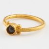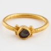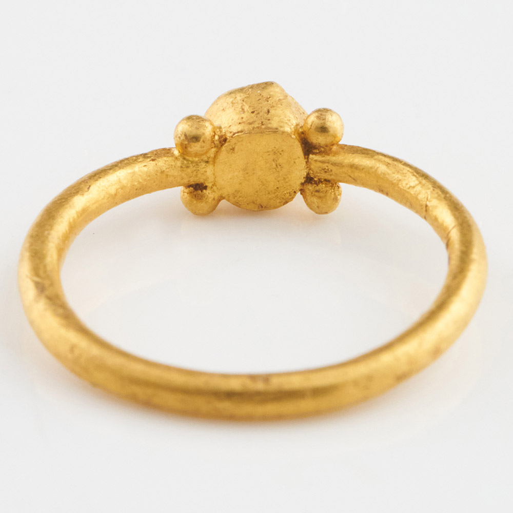 Description: Ring with garnet set within a gold bezel on four bead supports. Henig type IV