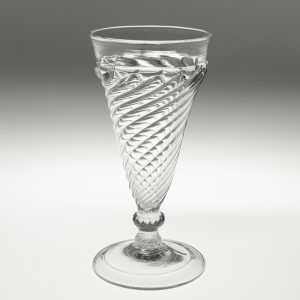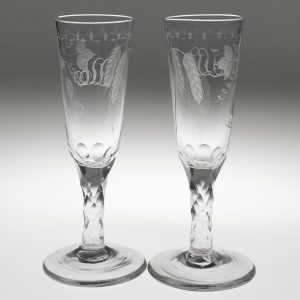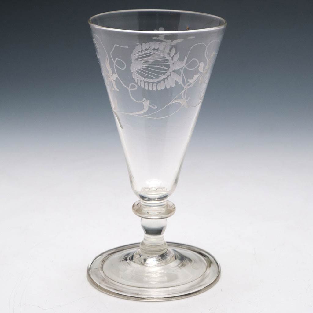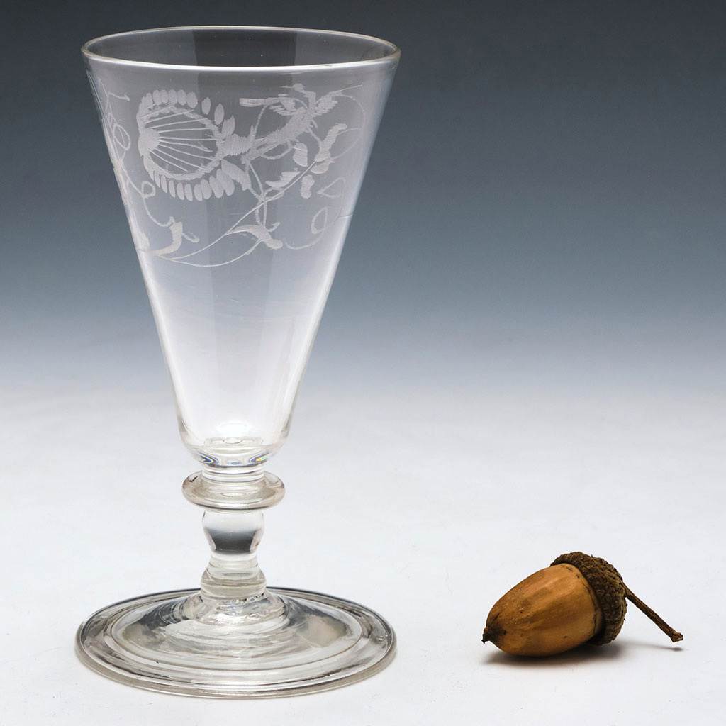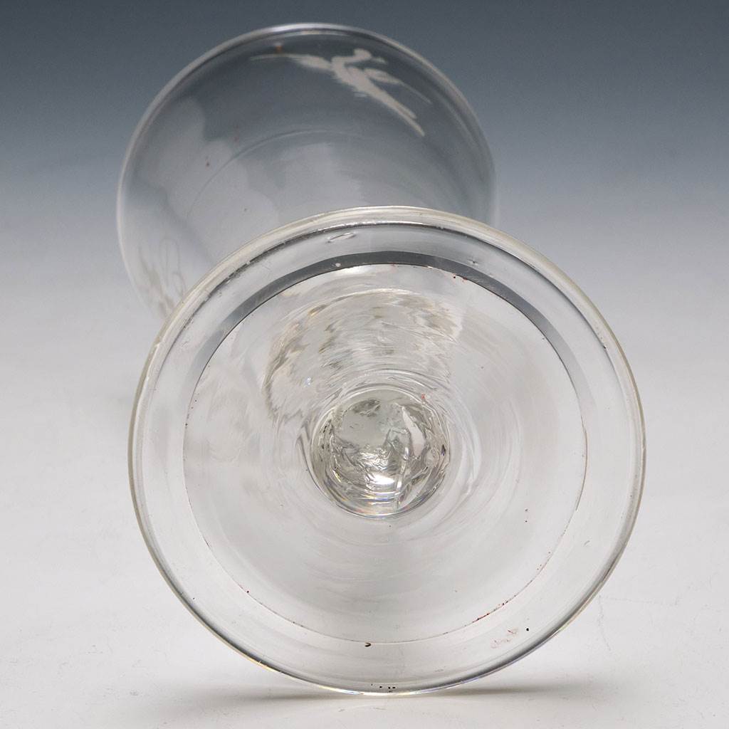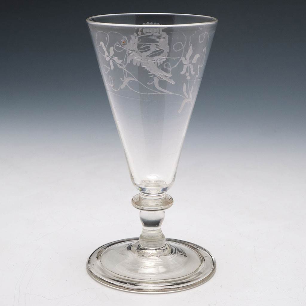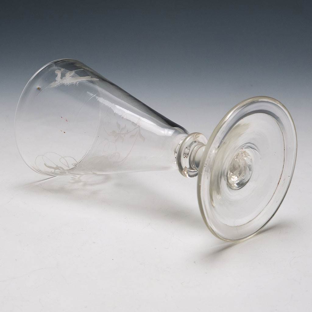 A fine Georgian ale glass with folded foot and engraved bowl. The engraving depicts a bird in flight and foliate design. This is not an 18th century example but one made in the early 19th century when the use of folded feet was reintroduced for short period when the glass tax in Ireland was restored.