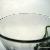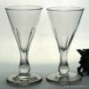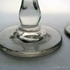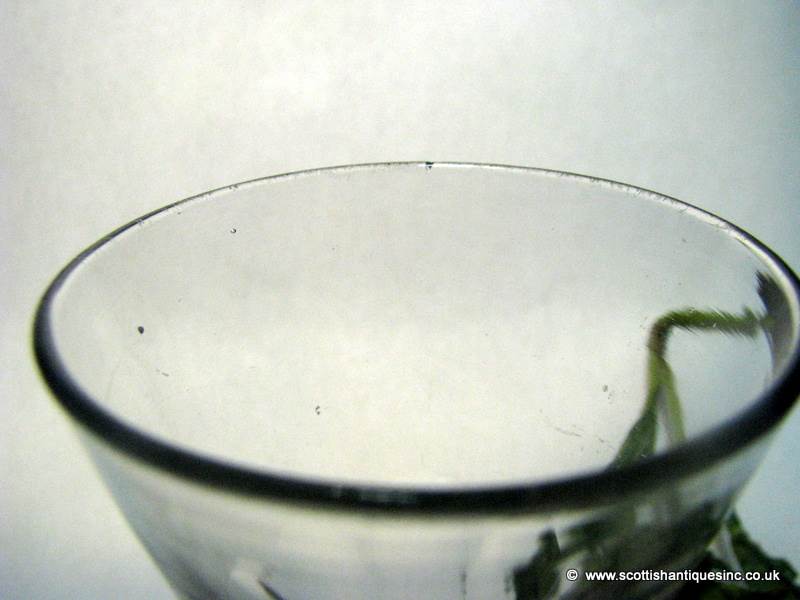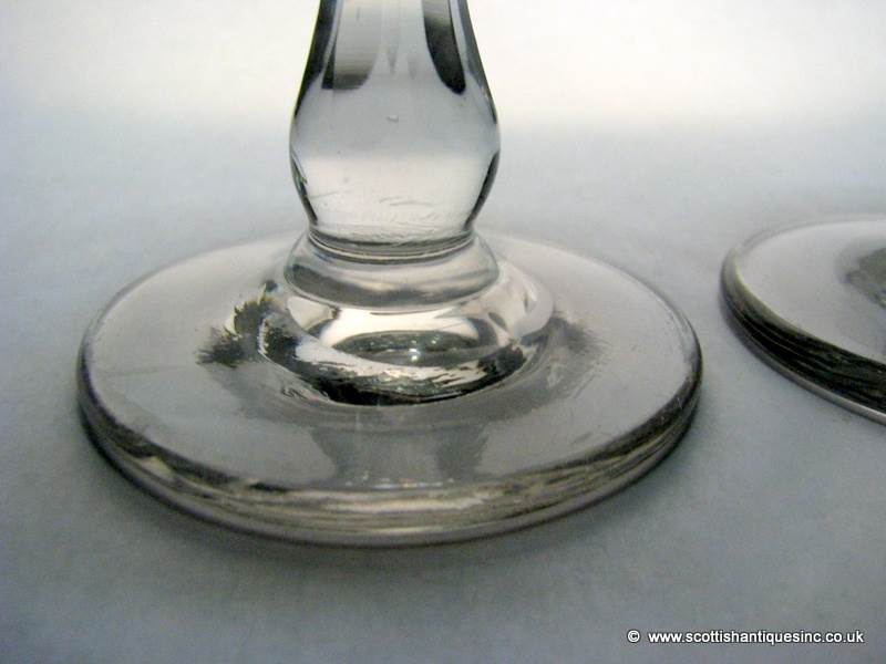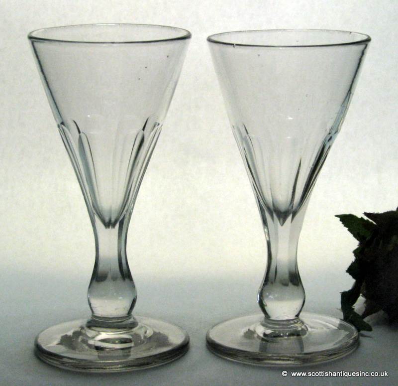 The glasses have conical bowls with slice cuts to the lower section. The cuts continue down to baluster knop stems. Plain feet with polished pontils. Height 4 3/4 inches. bowls 2 3/8ths inches. feet 2/3/8ths. English lead. one glass has a flea bite and can be seen at “noon” on the pictures.