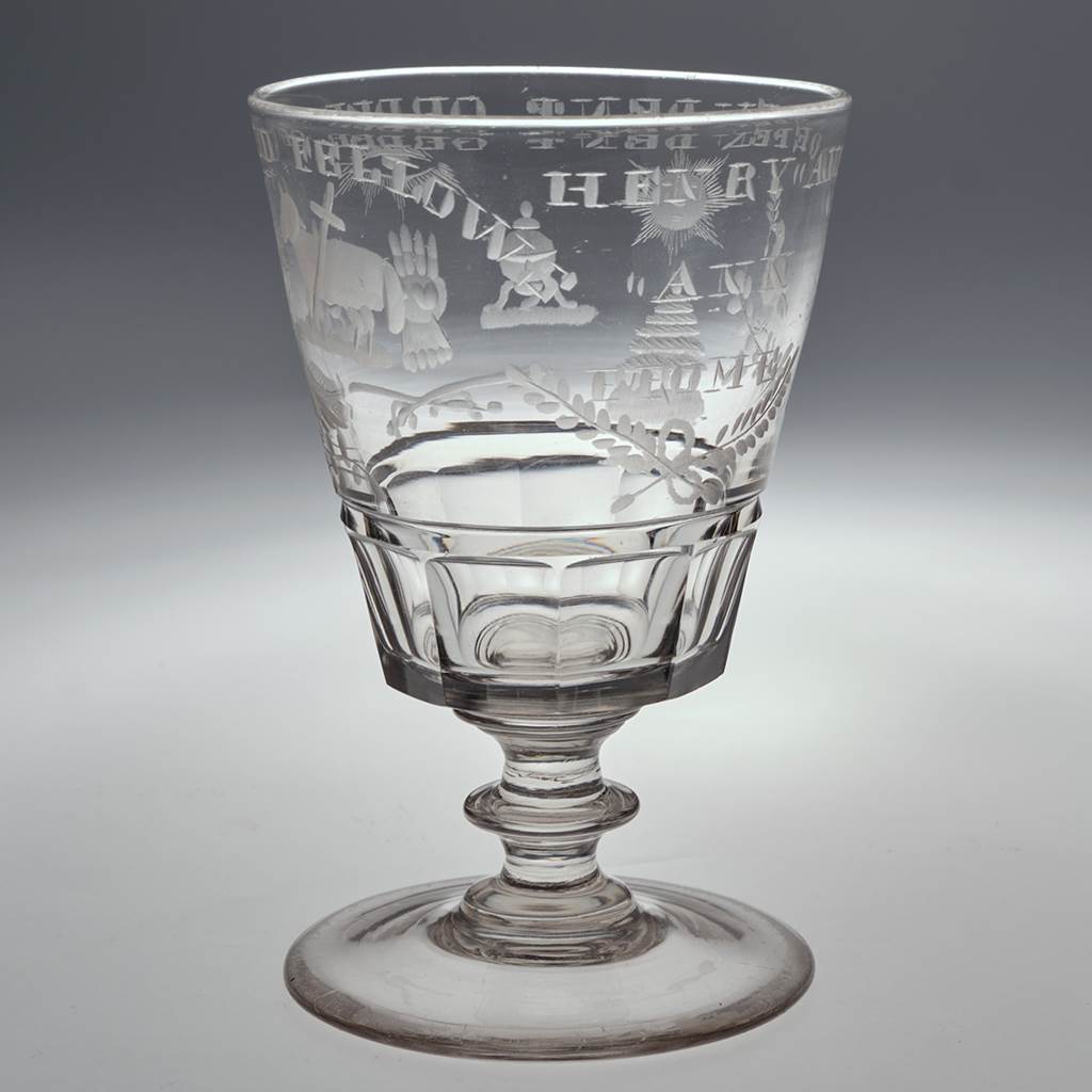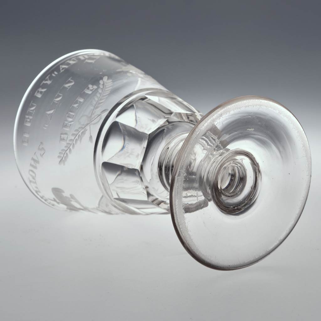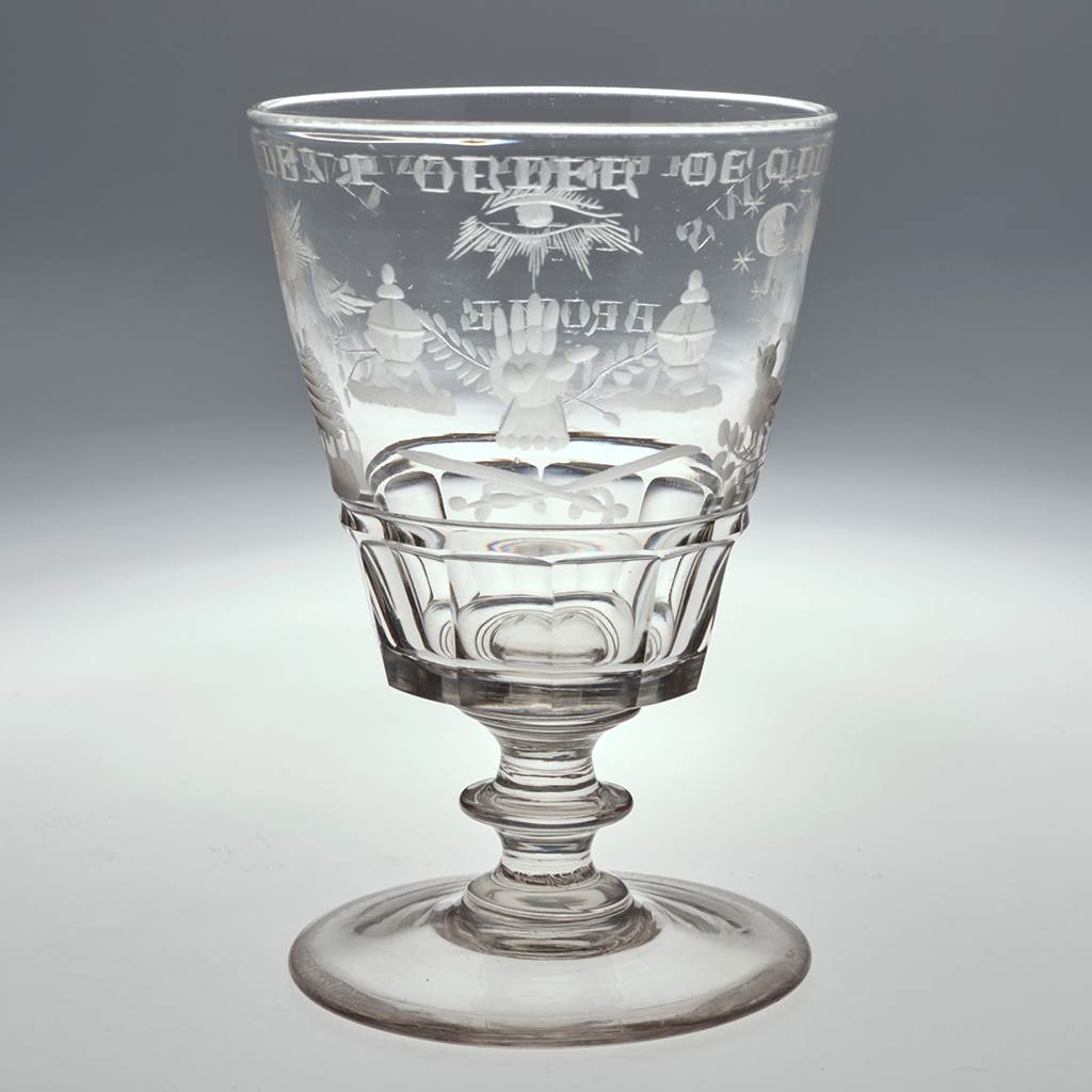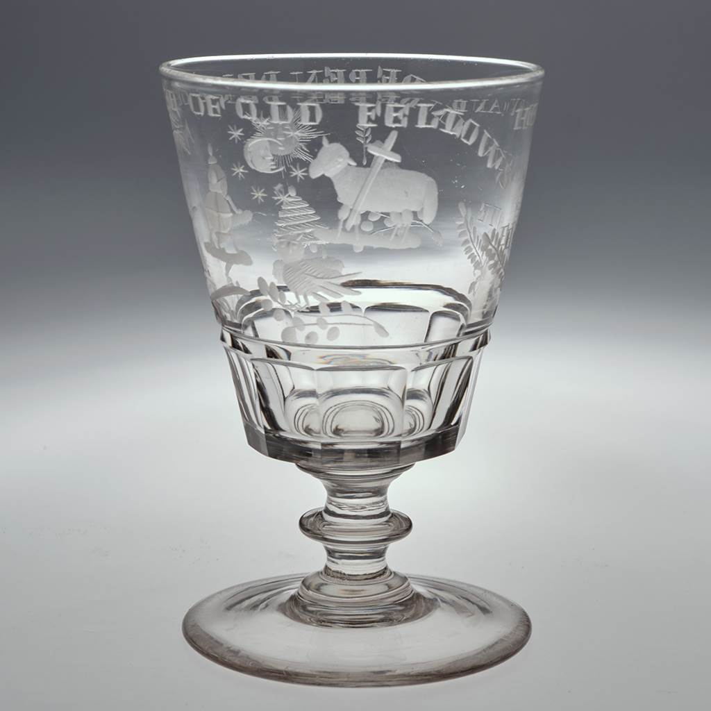 The Odd Fellows is an international fraternity originally operating in a similarly secretive way to the Free Masons but since becoming more publicly approachable.  “The Independent Order of Odd Fellows” is engraved on this rummer the independent order was founded in Manchester in 1810 as the Independent Order of Odd Fellows Manchester Unity. The original order had been divided by the Jacobite cause and many were dissatisfied with the way the order was now being run.