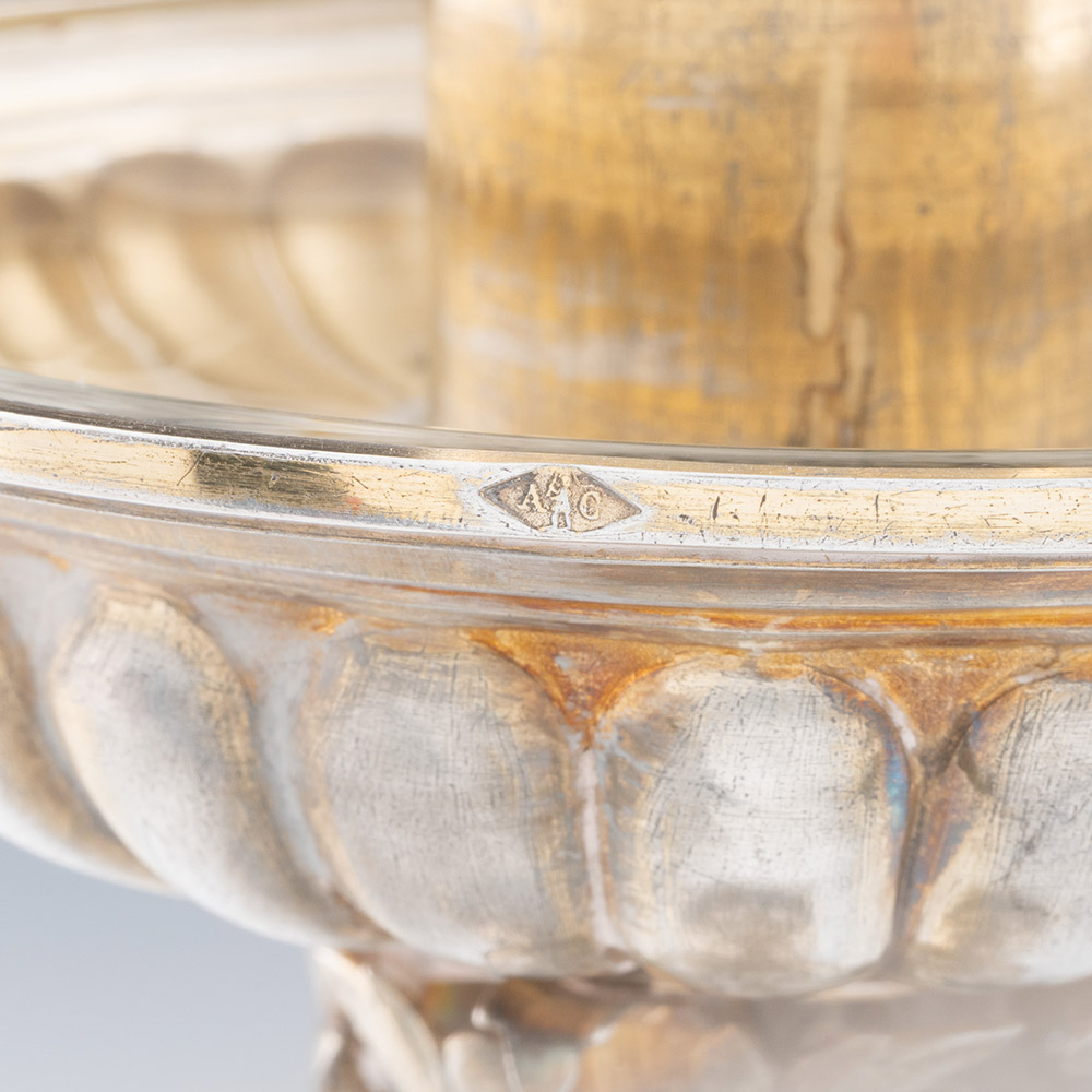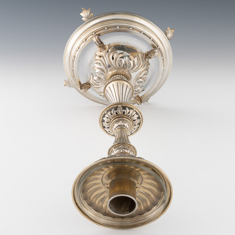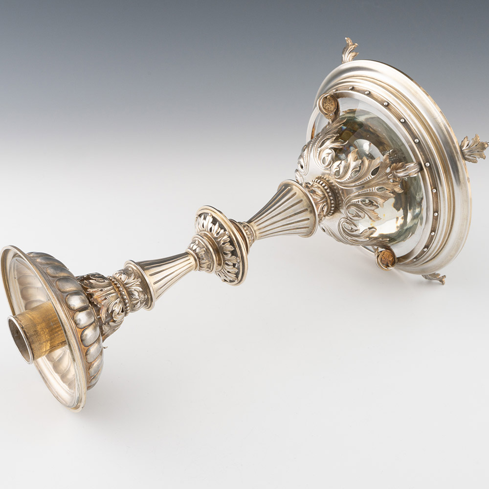 Decoration : Gadrooned drip pans with glass liners. Acanthus leaf cast decoration, beaded collar, further acanthus leaves aove reeded conical section. Annular acanthus leaf cast section with glass interior. The lower section of the stem is a mirror of the decoration above. Domed glass base with silver surround and further cast acanthus leaf decoration above and scroll terminals. The  terraced rim supports four acanthus leaf feet. Tests as 925 silver, but probably 958