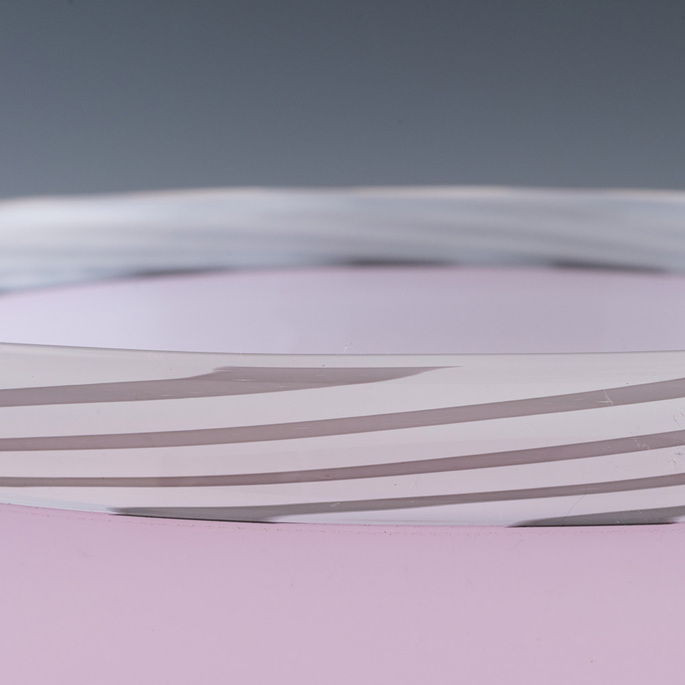 Bowl Features :Pink glass with white and grey rim and clear foot