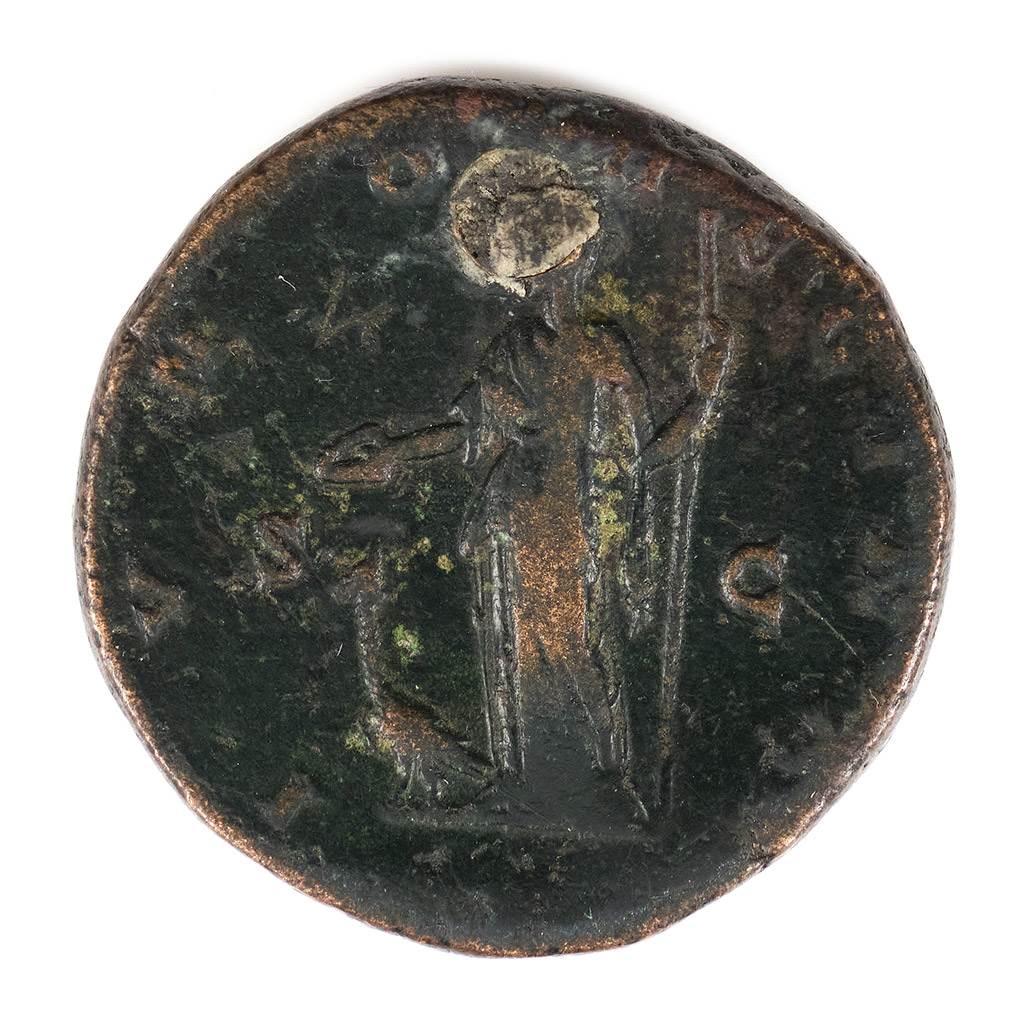 Juno Regina. on the reverse of the sestertius. was the goddess of protection for the individual and the state. Her sacred animals were birds and here she is depicted with a peacock. The Temple of Juno in Rome had sacred geese who. on one occasion. alerted the citizens by making such a horrendous noise. and thereby enabling them to defend themselves. when Gallic invaders tried to attack Rome. She was subsequently given the epithet Juno Moneta on this occasion. but here she is also known as Juno Regina as she was said to have watched over the women of Rome. Regina meaning ‘Queen.’