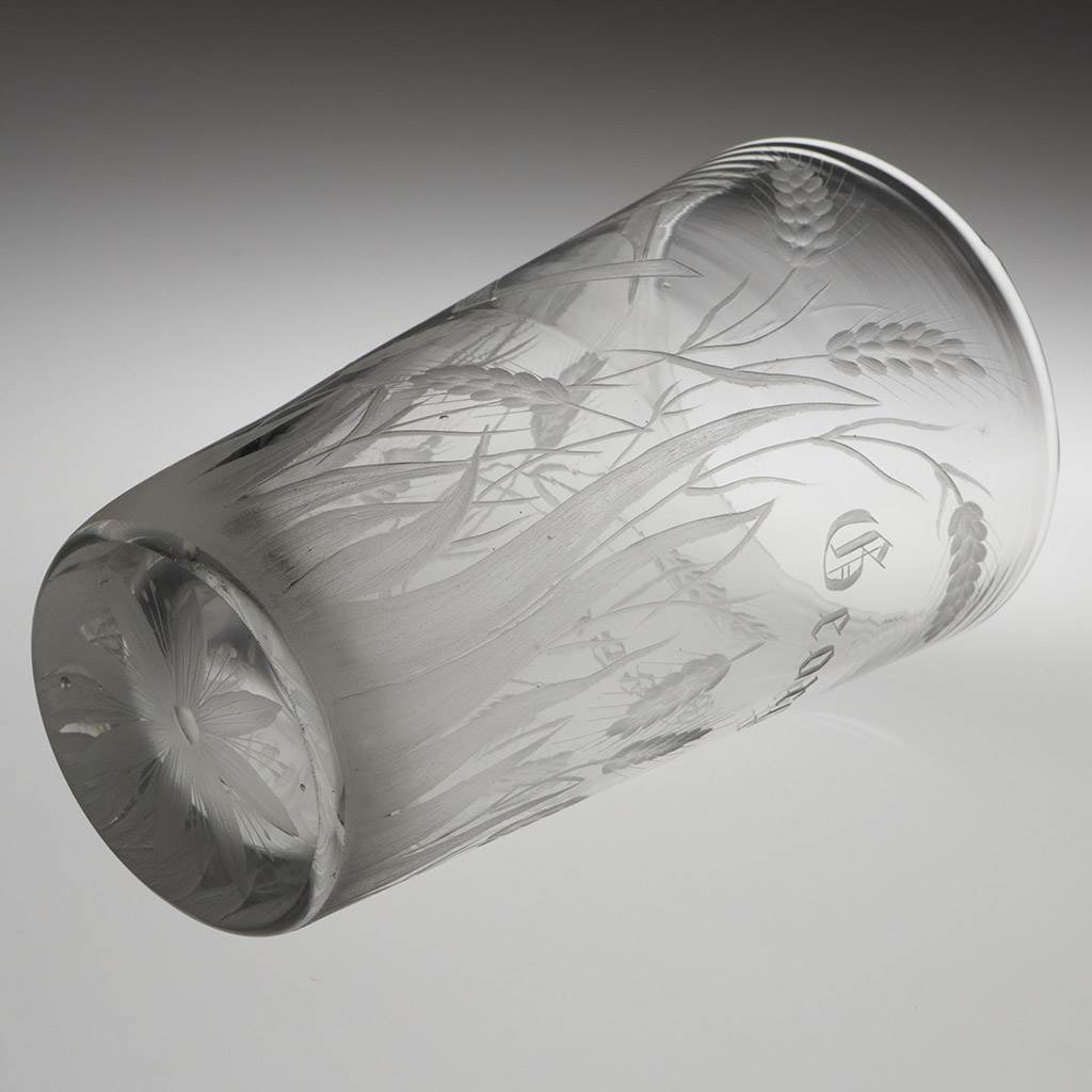 Bowl : Tapered. Engraved with the name George Esser. multiple ears of barley. set square and compass
