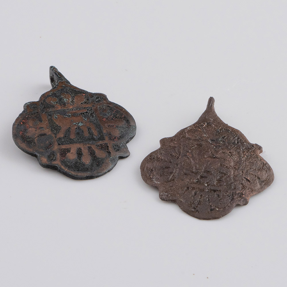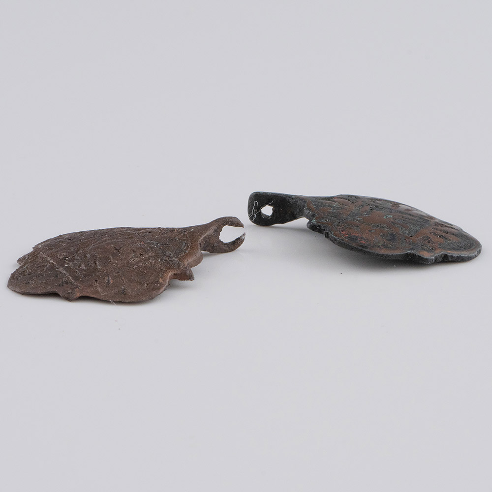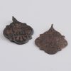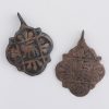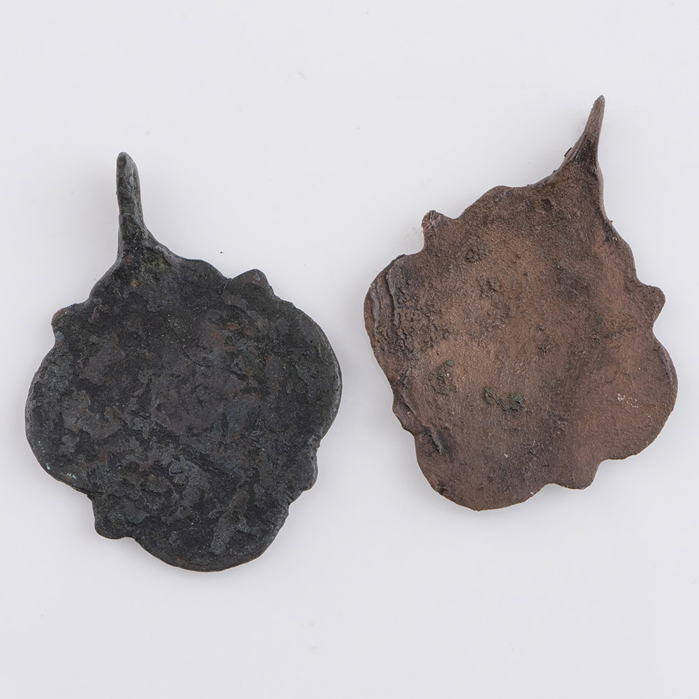 Description: Two copper alloy pendant mounts for horses harness with suspension loops. The design is of lozenge shape of four lobes with interstitial spurs, with a central square with lion passant and a group of three flowers in each lobe.