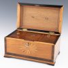 Decoration : Scrolled foliate brass handle with floral terminals. Mahogany banding to terraced cover and side panels. Front panel with inliad fan design. Three lift out compartments with brass handles