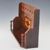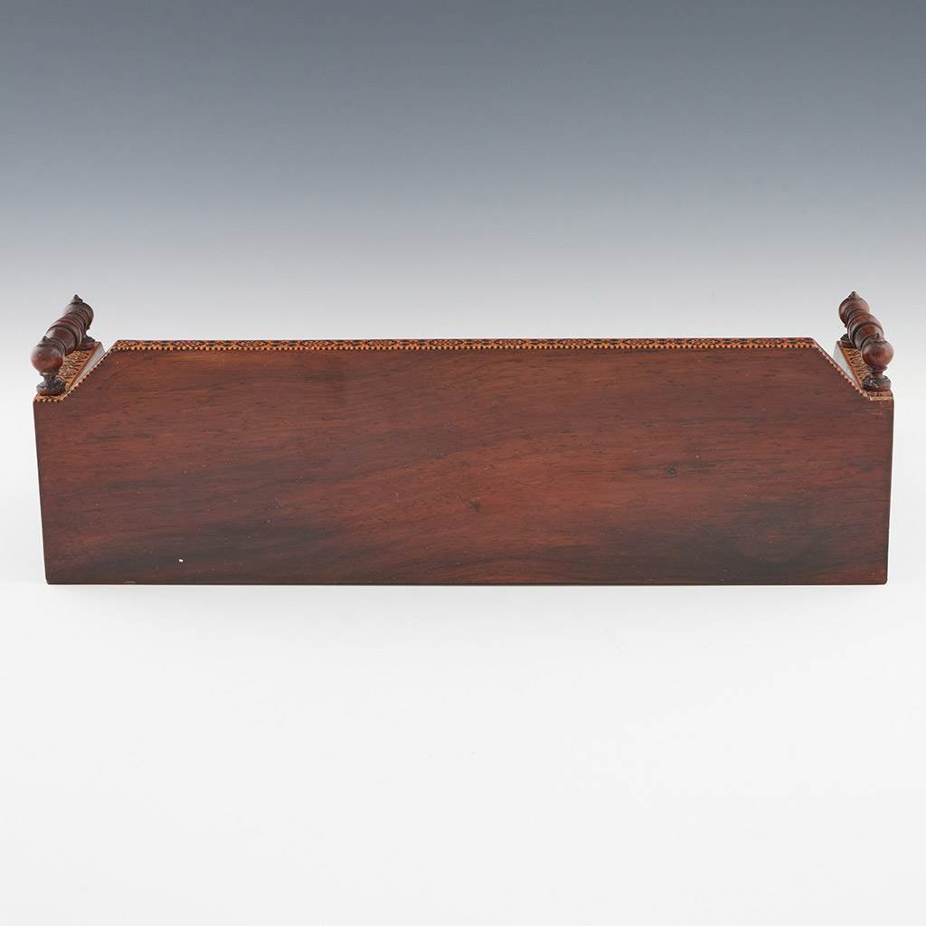 Decoration : Central foliate mosaic within a foliate border with keylines. THere is ia foliate band closer to the front of the tray with geometric borders also within keylines. The side panesl decorate dwith OXO style bands and a chainlink pattern to the front. Two turned wood handles.