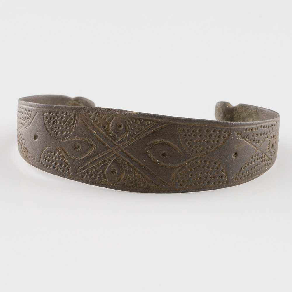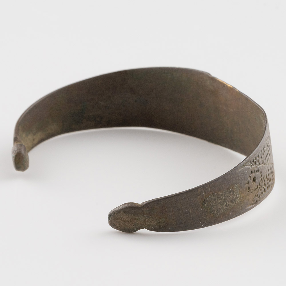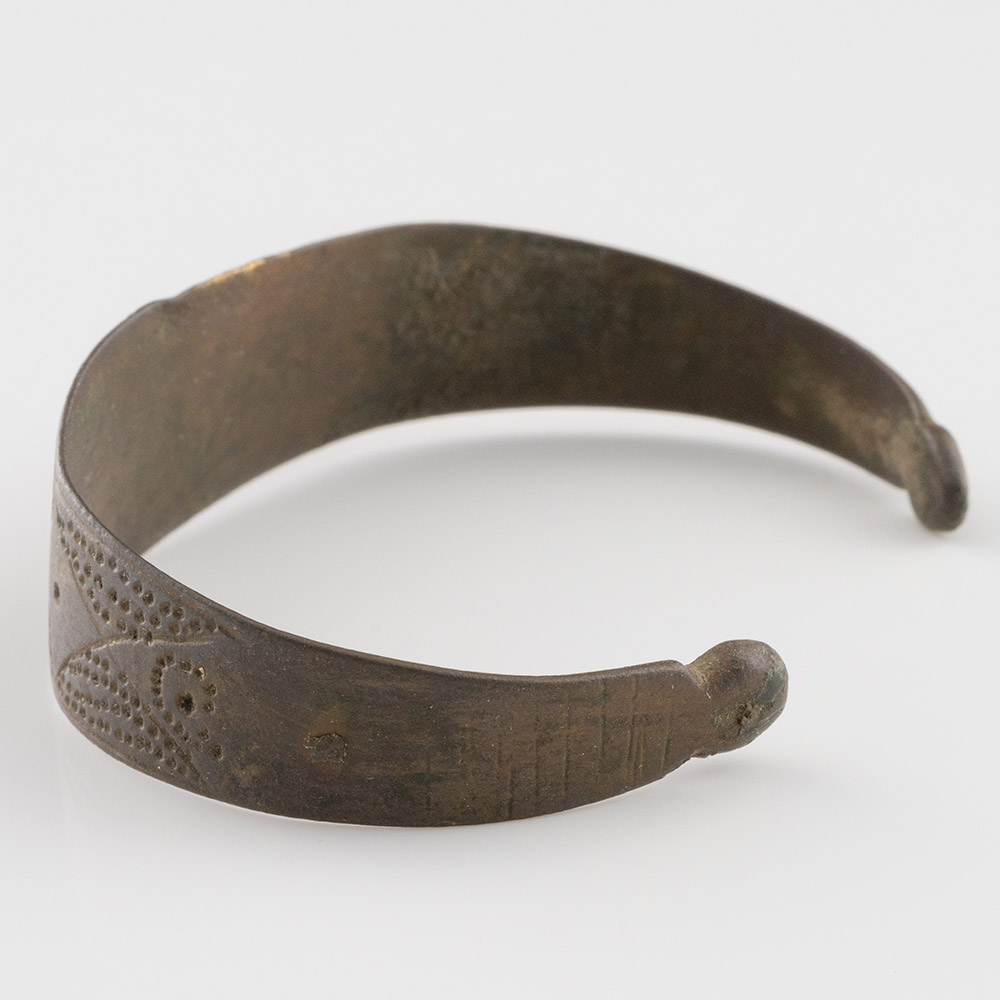 Description: A penannular bracelet with a flat-section shank, bulb finials, decorated with panels of ribs and punched pellets