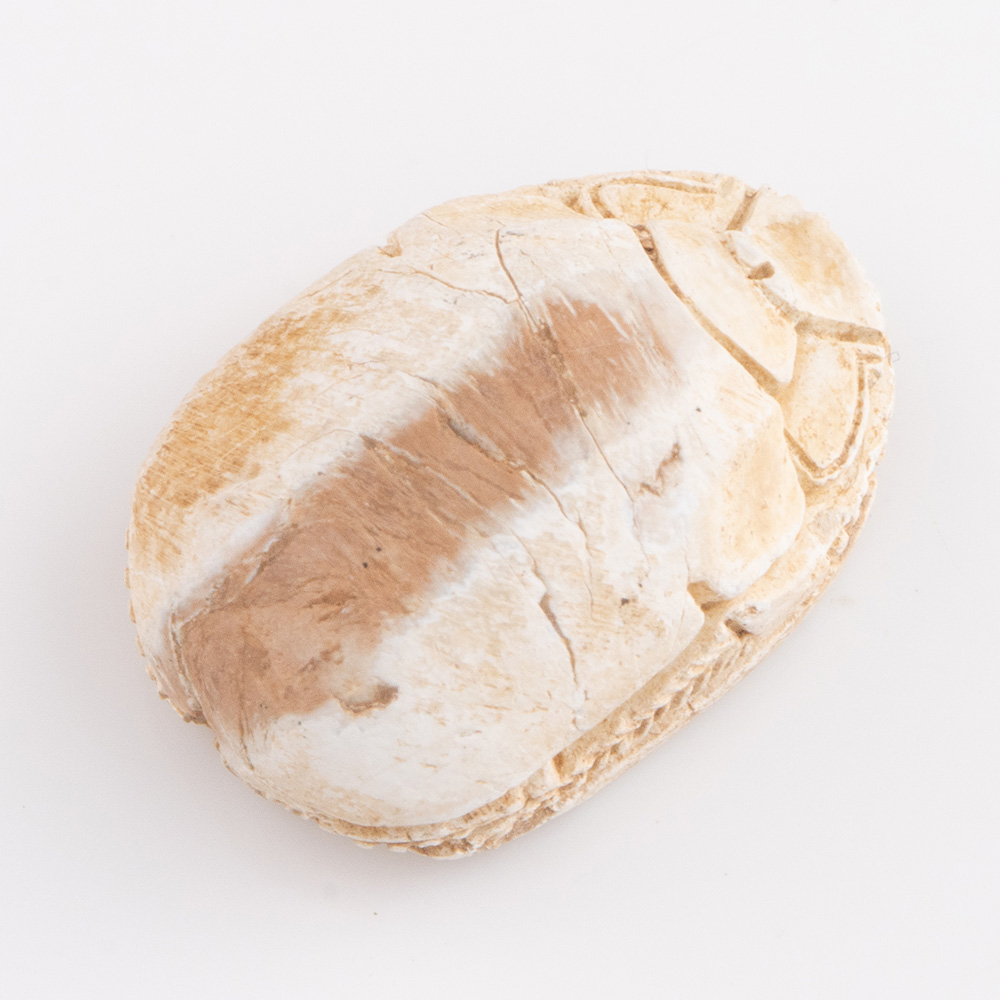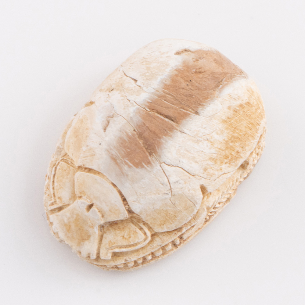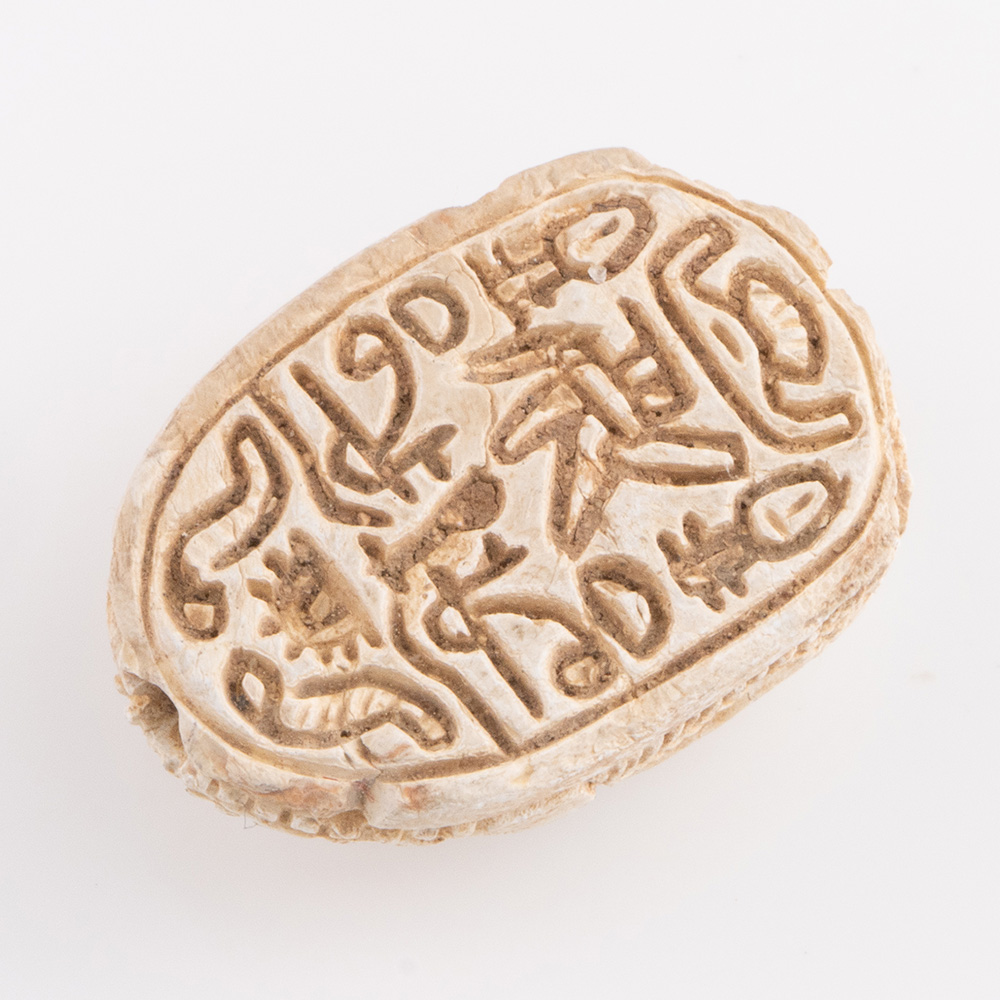 Small amulets in the shape of scarab beetles, often with hieroglyphic inscriptions, were dedicated to a deity or pharaoh, but could also have the personal family name which allowed it to be used as an impression seal. They are often found buried with a mummy to help it on its journey to the afterlife. Our example shows pseudo-hieroglyphics with udjat eyes, nefer sign and bee which are interpreted as protection and luck icons carved on its base along with other symbols of eternal decoration.