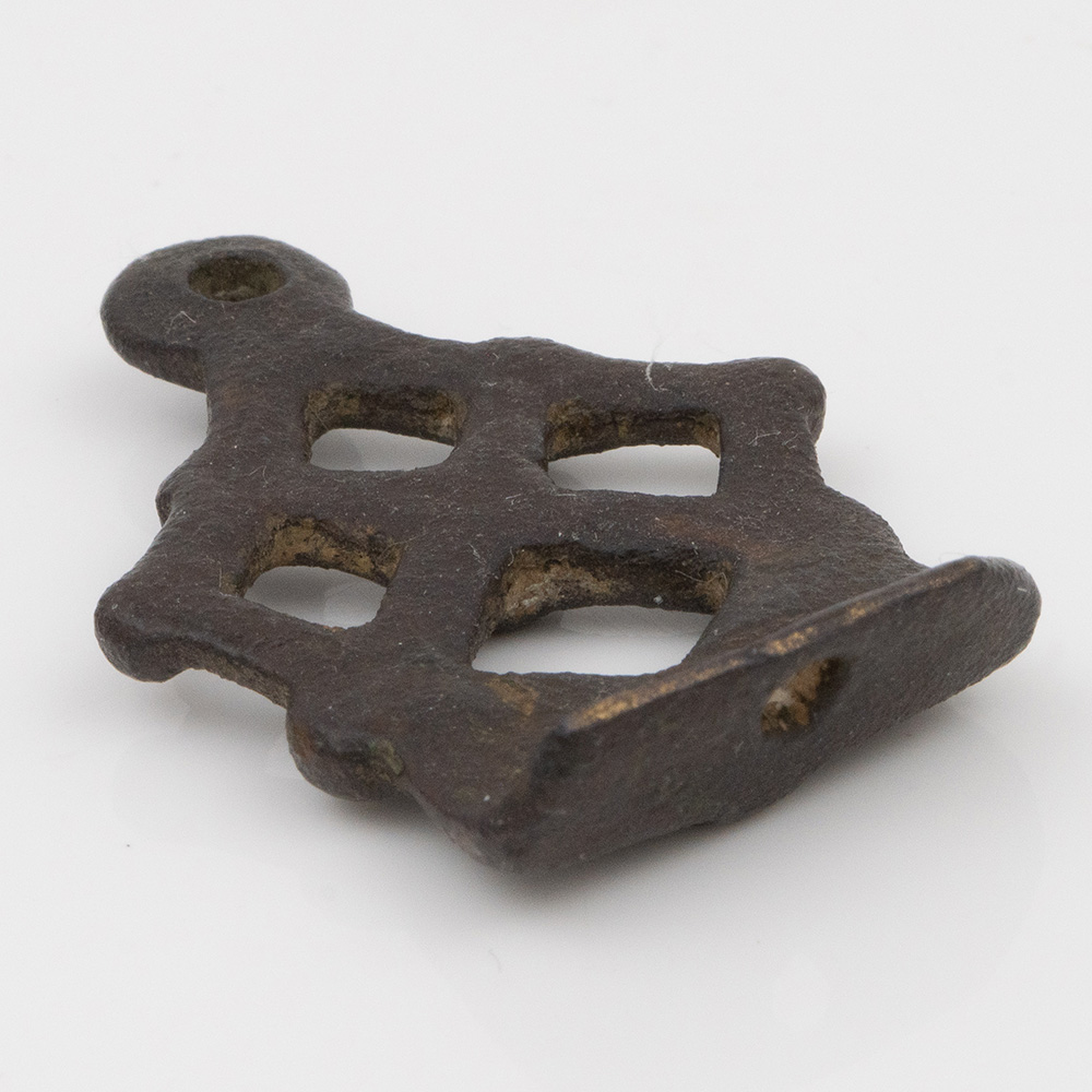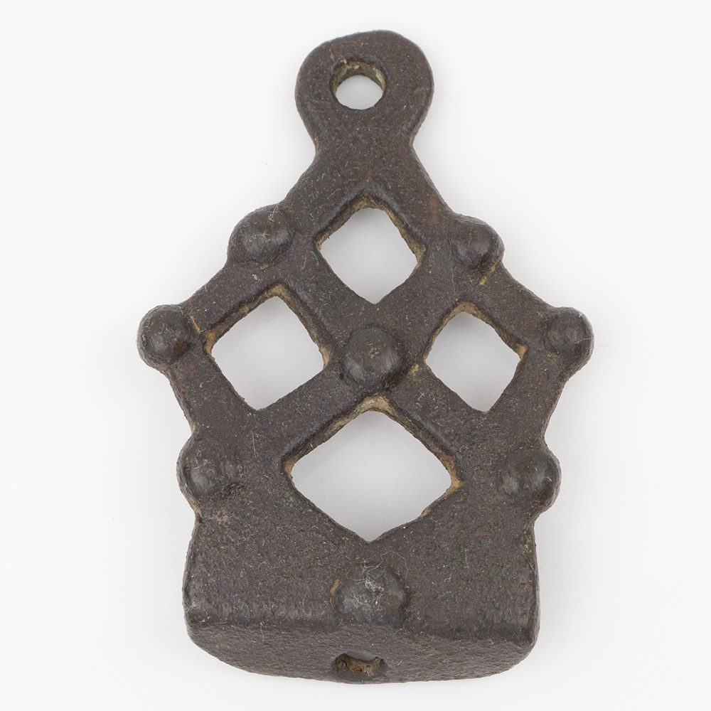 Description: A lozenge-shaped, bronze stirrup attachment mount with lozenge-shaped piercings and raised pellets to body, single ring to apex for attachment, patinated.