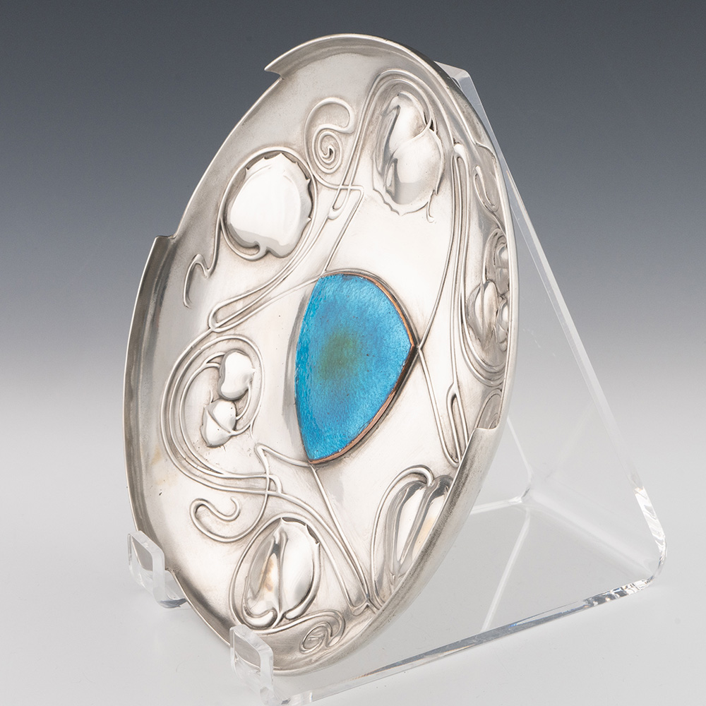 Decoration :The shaped form embossed with leaves and sinuous stems around a triangular turquoise enamel plaque