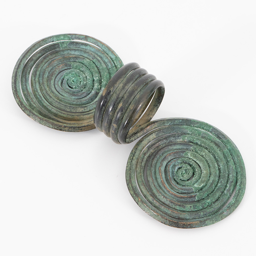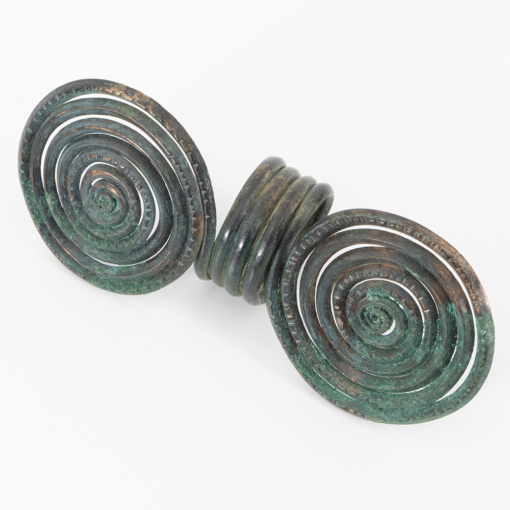 The spiral pattern has been associated with the Celts but also earlier on rock art as far back as the Neolithic. It is supposed to symbolise balance and its symmetry would suggest this. Formed of coils of thin wire rod, the skills needed to have made this at such an early date is astounding. The ‘spectacle’ design is also seen as a clothing fastener, pendant and in triskele form. Sadly any attachment mechanism, such a pin, has been lost to time; how this heavy piece of jewellery was ever worn is left to the imagination.