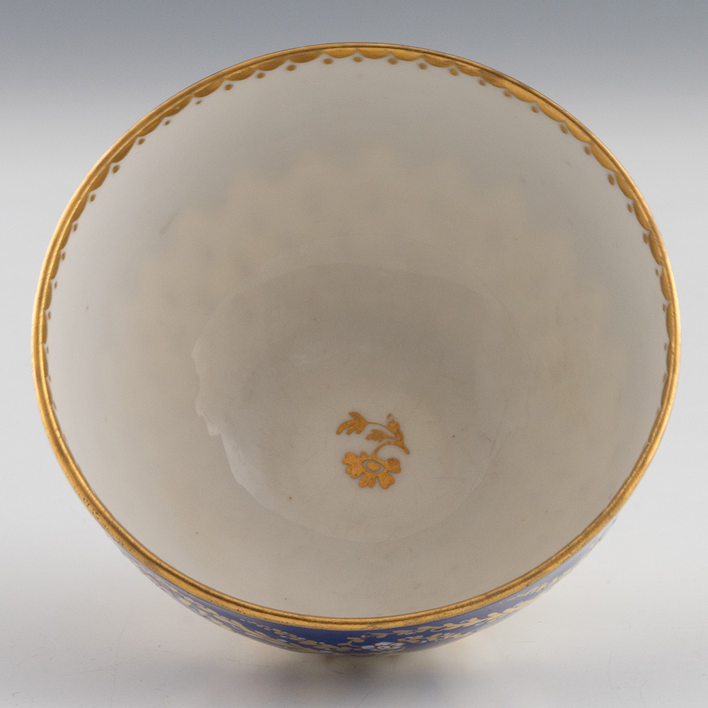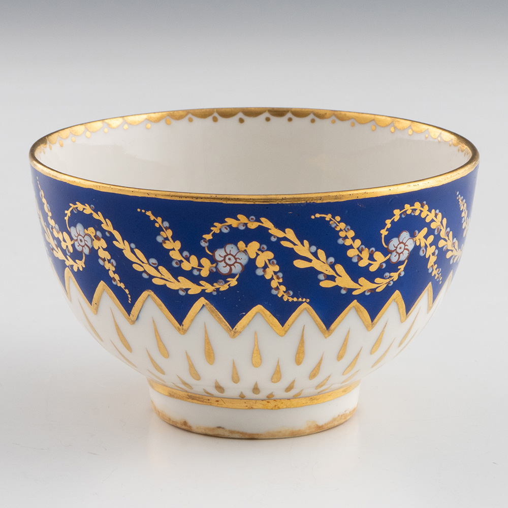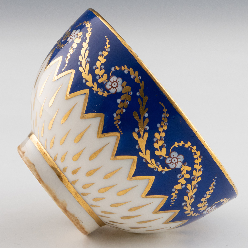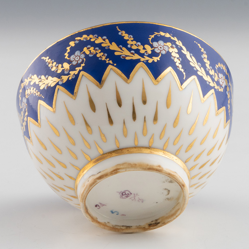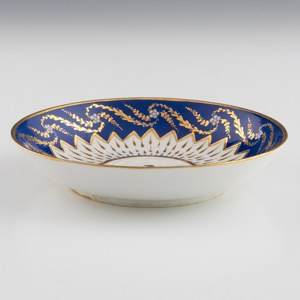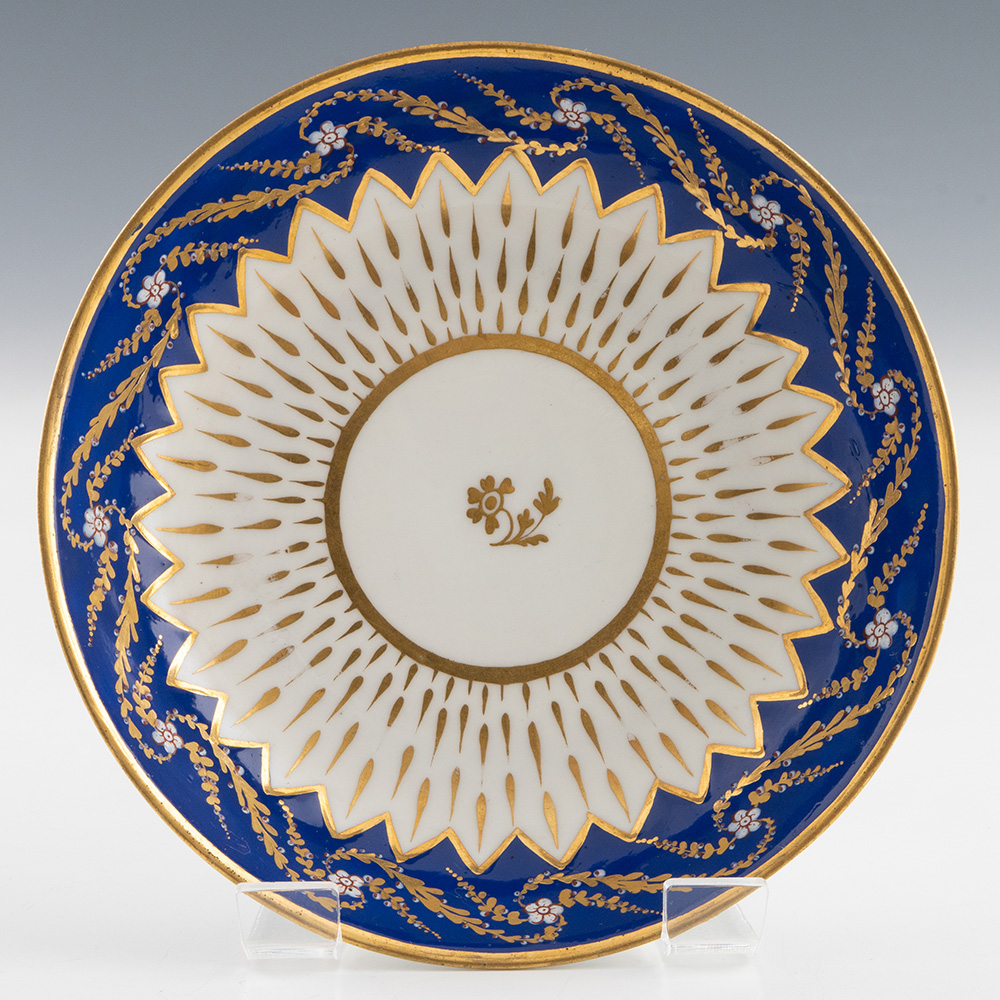 Pattern : Van dyke gilded border separates the white and blue grounds. Gilded wheat band to rim with white enamelled flowers.