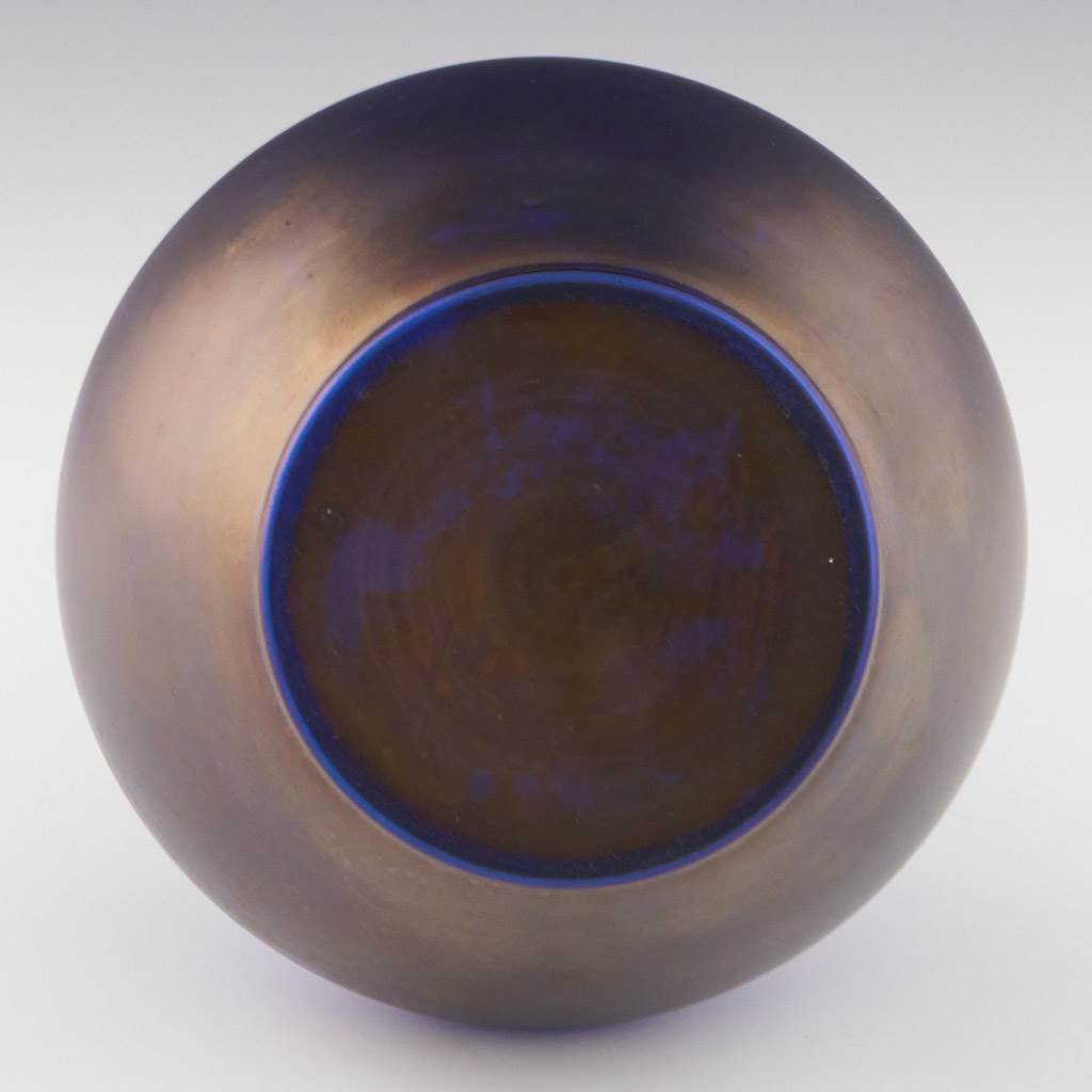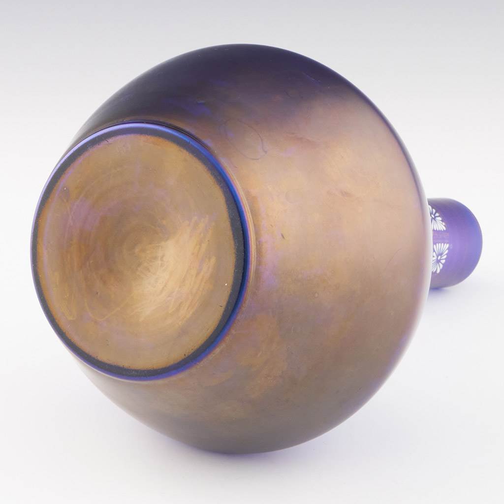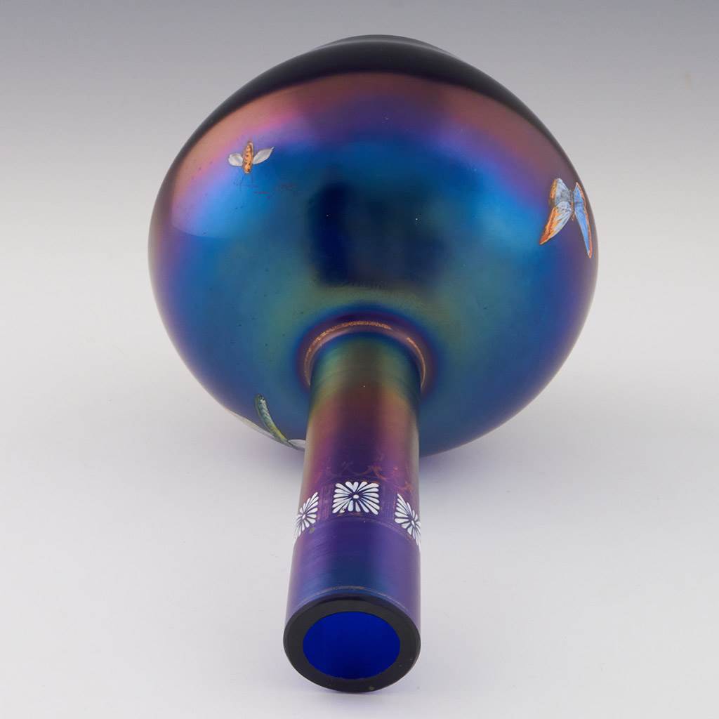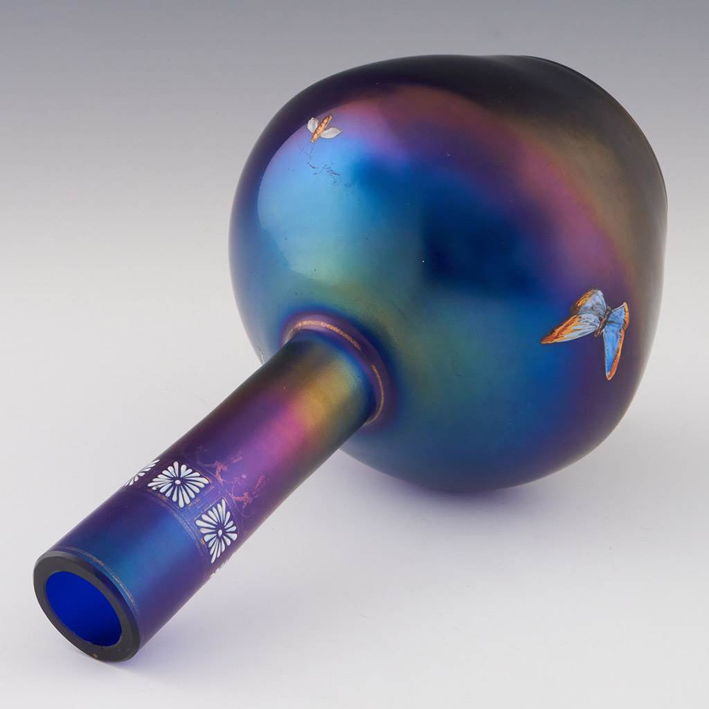 The glass is highly reminiscent of Webb’s Bronze range with it’s deep iridescence. However. the style of decoration and fine enamelling is much more typical of French and Austrian designs of the early 20th century.