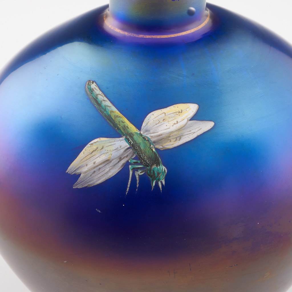 Bowl Features : Classically inspired shape in iridescent glass with enamelled stylised floral band and three enamelled insects including a butterfly. moth and dragonfly