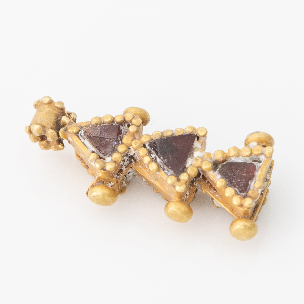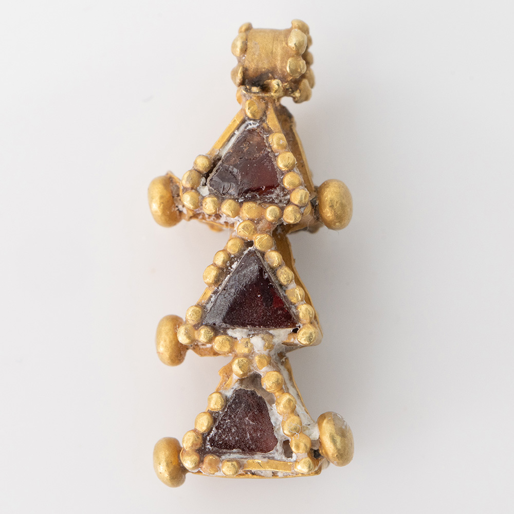 Description: An exquisite little bifacial pendant framework of gold, with three triangular tiered cells containing polished garnets cloison; each cell edge is granulated with a knop to each side and there is a a granulated suspension loop to the top. Wearable.