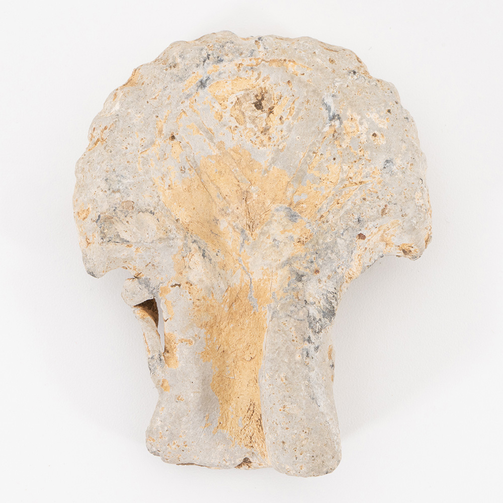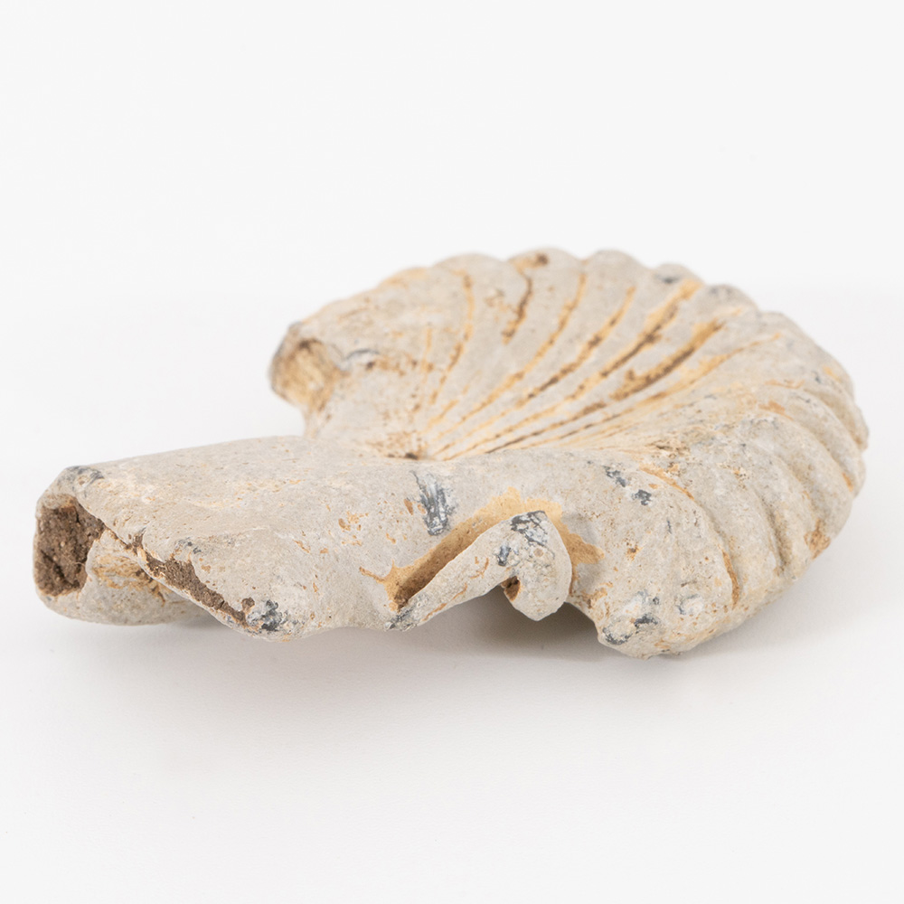 Description: A metal scallop-shaped hollow flask made of lead or pewter (probably lead alloy due to patina), reverse with scallop shell markings, the obverse with chevrons and scallop edge, two lugs to either side (one missing the other broken).