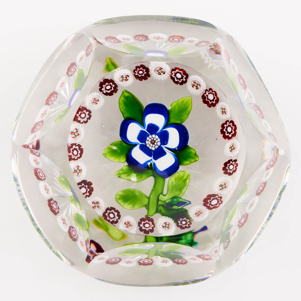 The primrose with a star dust cane stamen and blue and white petals and grreen leaves. The outer garland of white cogs with millefiori centres alternating with maroon canes with white floral centres. A cut top window with six side printies and star cut base