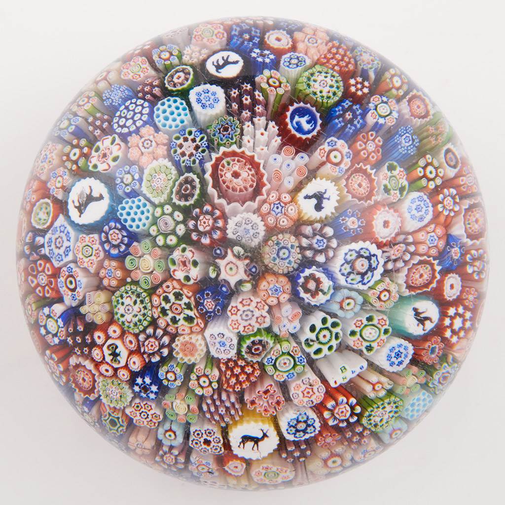 Features : Gridel canes of Cockerel. Dog. Horse. Devil. Stag. Butterfly Flower within a carpet of millefiori canes