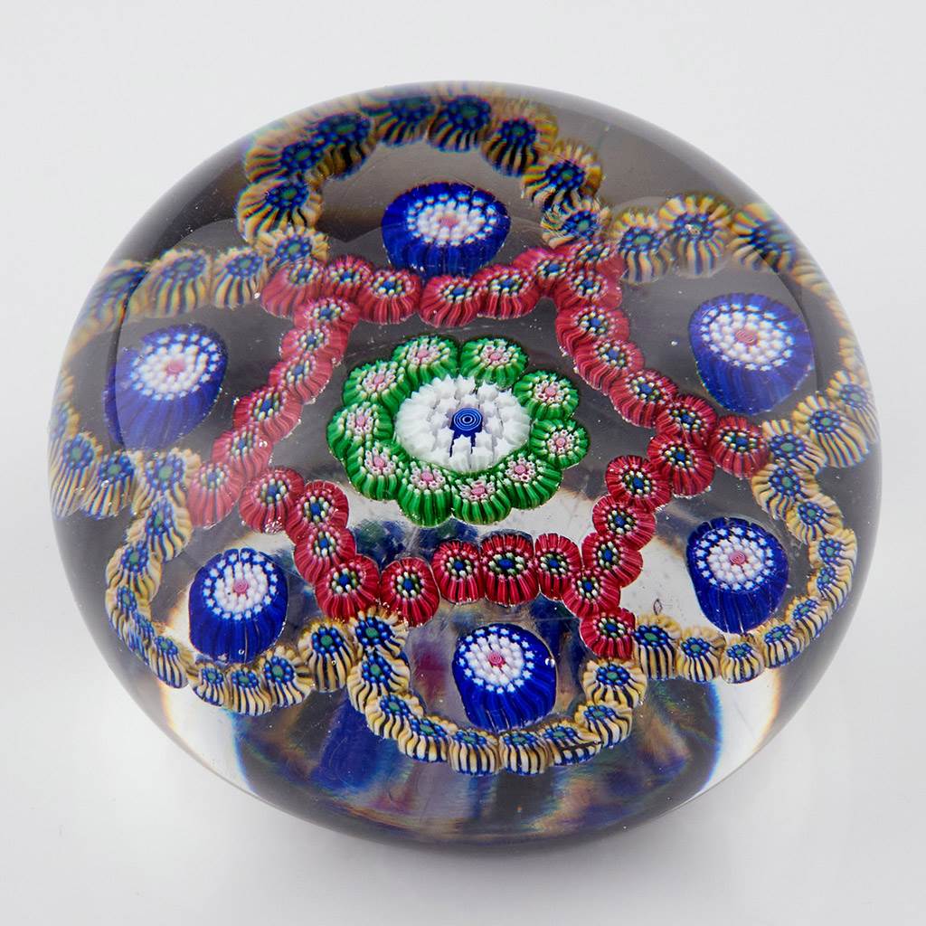 Features : A trefoil of millefiori canes interspersed with complex canes on a clear ground
