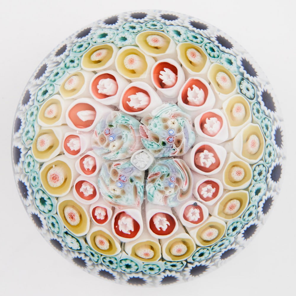 By this same time, the popularity of French millefiori weights was impacting the UK, and both George Bacchus and the Islington Glass Works were doing their utmost to profit from the wave of enthusiasm. George Bacchus & Sons in particular perfected the creation of concentric millefiori paperweights and close-pack millefiori paperweights, using Queen Victoria silhouette and profile canes, cogs and ruffles, oak-leaf canes and ‘combination’ canes made from bound and drawn gathers of up to a dozen ‘standard’ canes.
