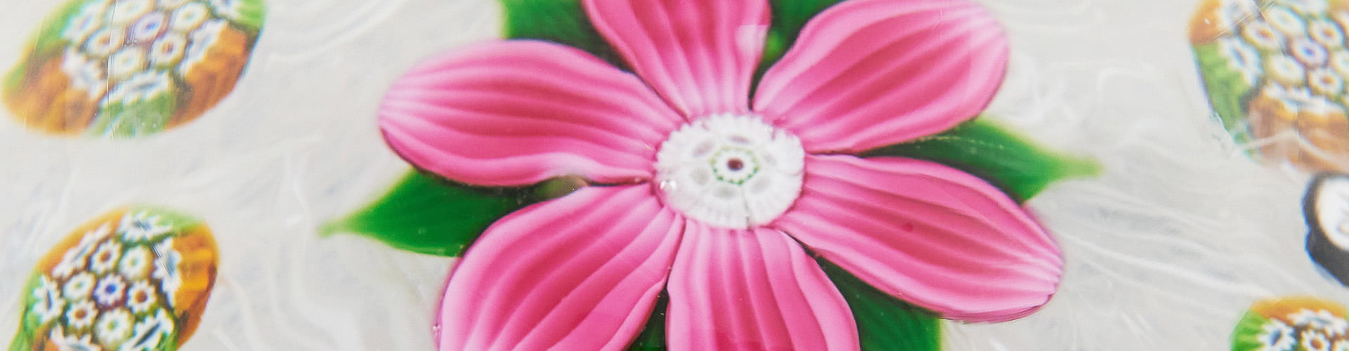 The bulk of the Selkirk Glass paperweights produced there tended to shy away from the conventional forms of millefiori canes and lampwork. Instead, the manufactory produced more abstract works based on astronomical, meteorological or naturalistic themes. Where millefiori were used, they tended to be for detail or punctuation rather than the bundled arrangements often seen elsewhere, or as ‘floating slices’ in suspension. These were particularly prevalent on the limited edition glass paperweights made specifically for the collectors’ market.