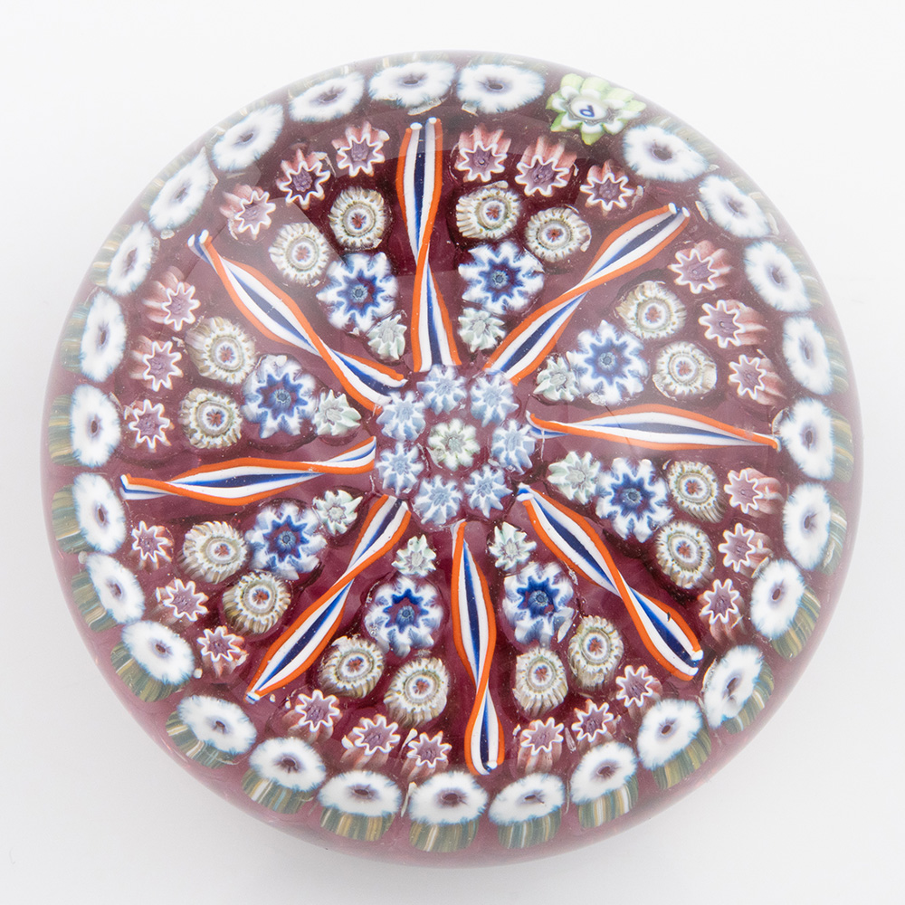 Features : Central rosette with eight twisted cane radials with five further bands of concentric millefiori on a rose ground.