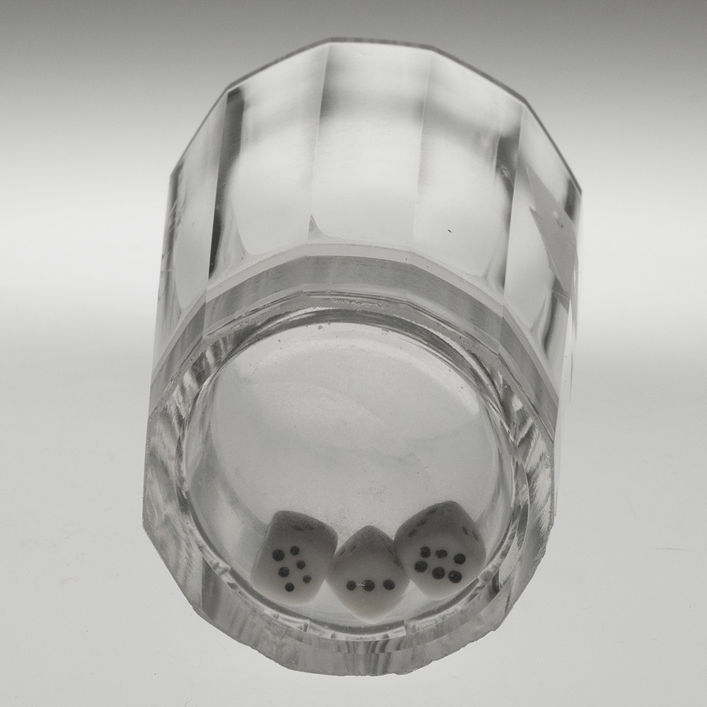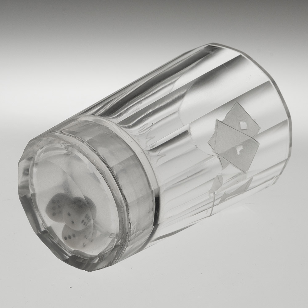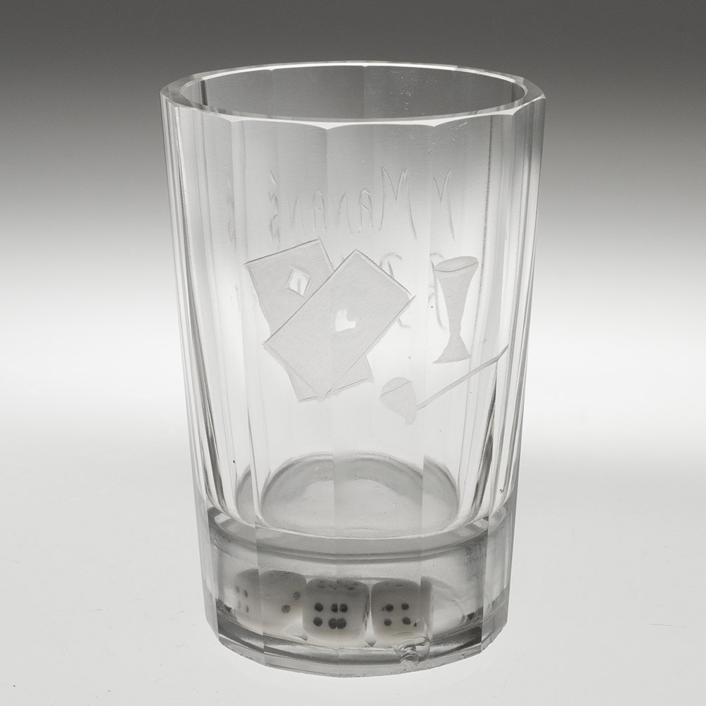 Bowl : Dodecagonal (12 panels) engraved with playing cards and ale glass and a pipe and ‘Man’s Ruin’. Three dice with the hollow base