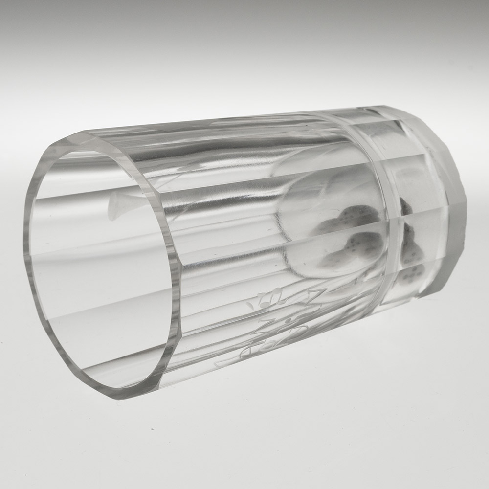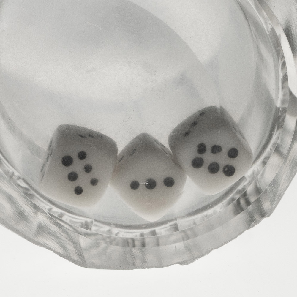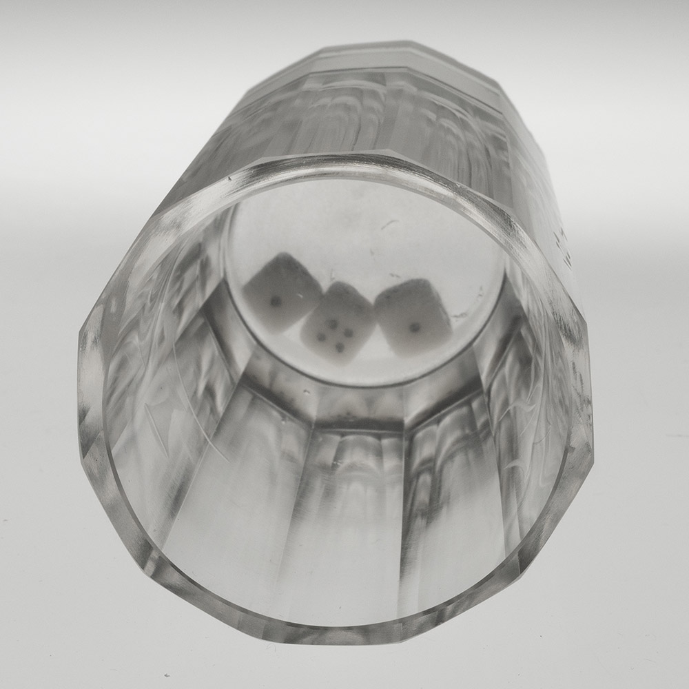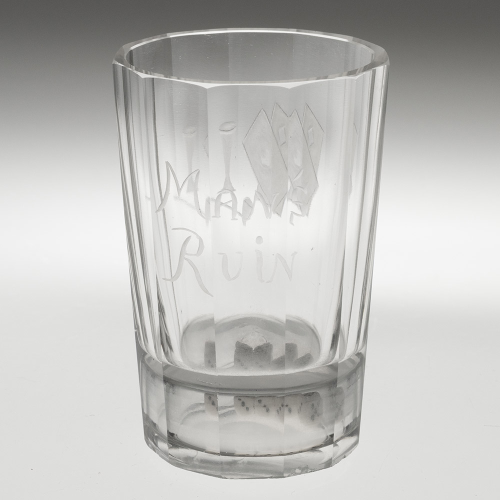 Bowl : Dodecagonal (12 panels) engraved with playing cards and ale glass and a pipe and ‘Man’s Ruin’. Three dice with the hollow base