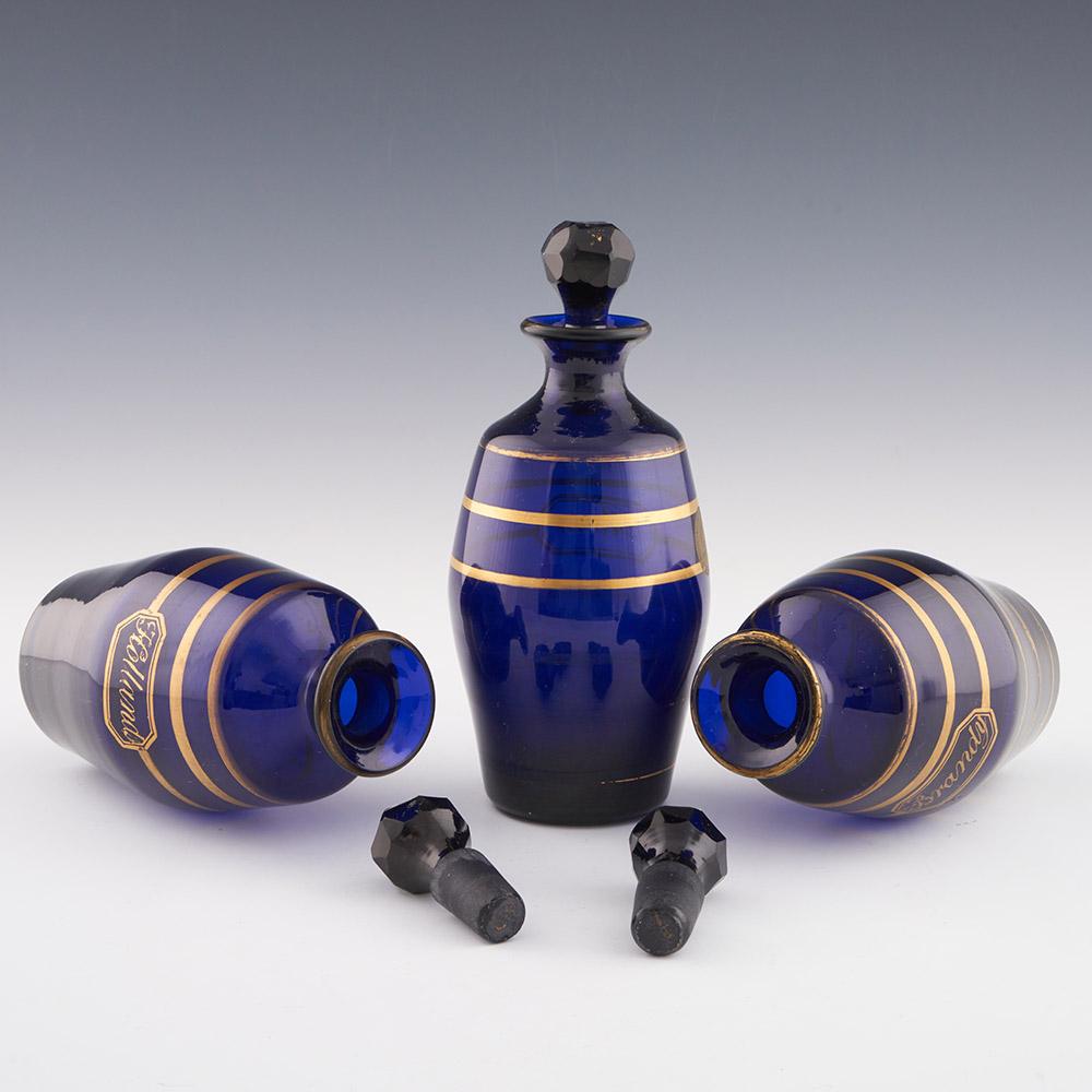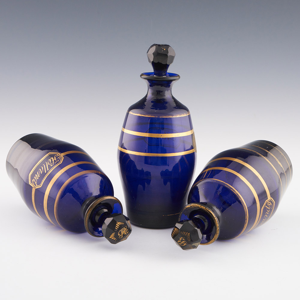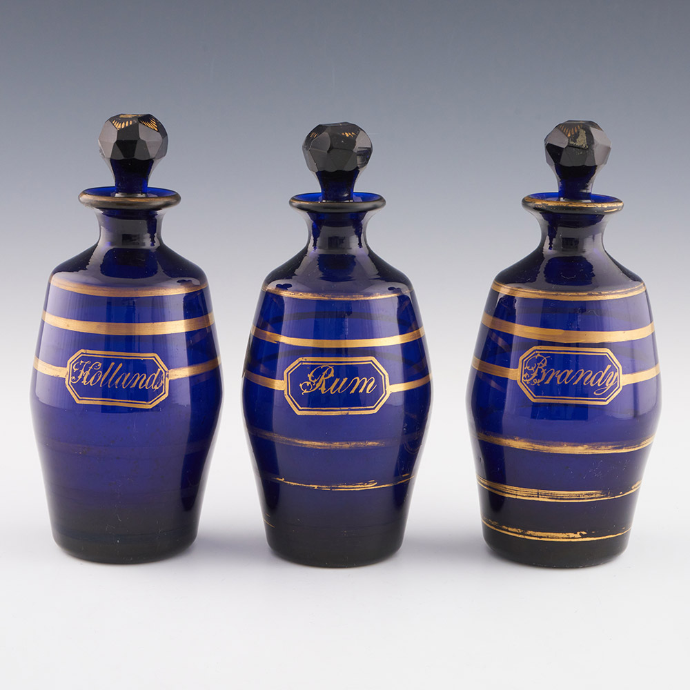 Body : Barrel shaped with gilded bands and cartouches with labels for Brandy, Rum, and Hollands