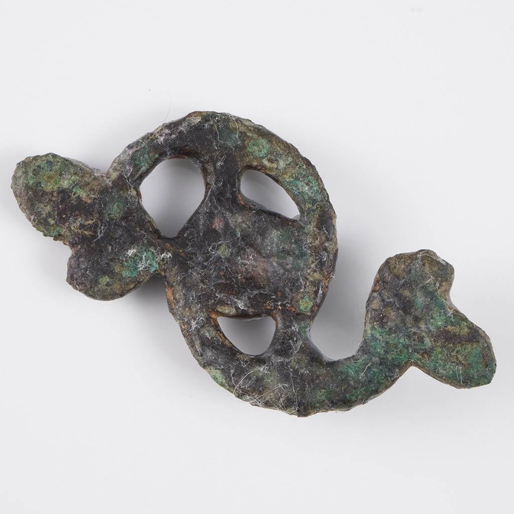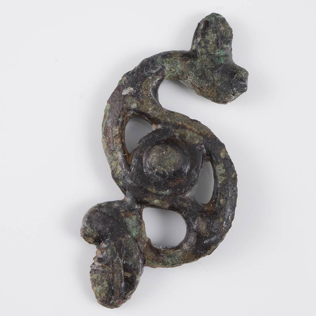 Description: An exquisite rare bronze plate dragonesque fibula with an s-shaped openwork body and stylised animal head and central boss. As is often the case with these brooches. the loop pin is missing.