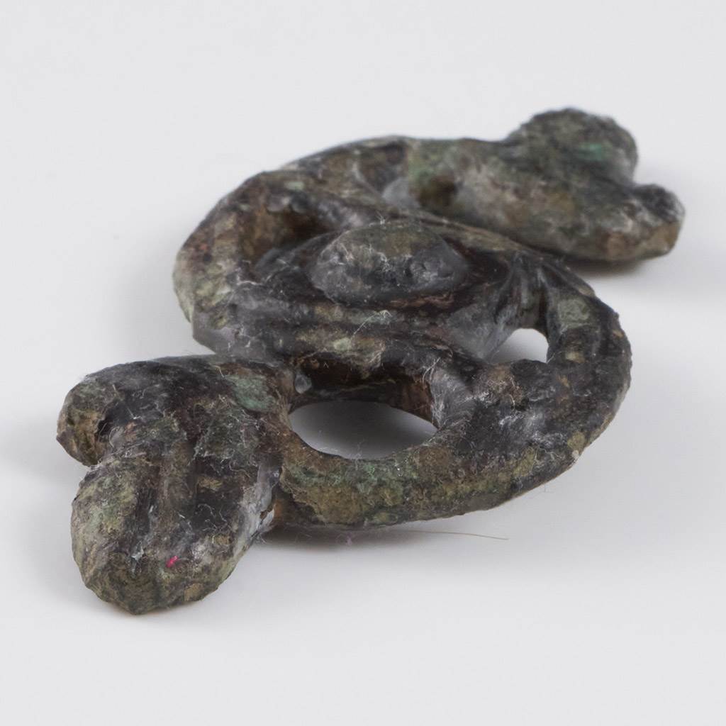 Features and Provenance: Brooches as clothes fasteners have been made since the bronze age. As skills and metallurgy advanced. so did the size and detail of the fibulae. They were still used by the Romans. as buttons had yet to be invented. This type of zoomorphic brooch is thought to be derived from Celtic patterns of fibula and have been found in Britain. especially on the Northern fringes (Brigantia) such as near Hadrian’s Wall. The pin. very often missing. was attached by a loop to the head and latched around the body of the brooch at the tail end. It was probably used for heavy wool items.