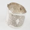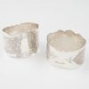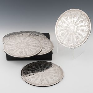 Decoration : Chased scrolled design with vacant cartouches and scalloped rims .